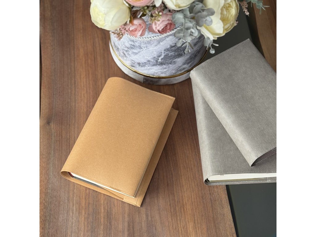 Ručně šitý obal z kvalitního pratelného papíru, který je příjemný na dotek a odolný pro každodenní používání. Díky nastavitelnému zadnímu přehybu se snadno přizpůsobí tloušťce knihy – klopa se jednoduše zahne pod přišitý pásek ze stejného materiálu.