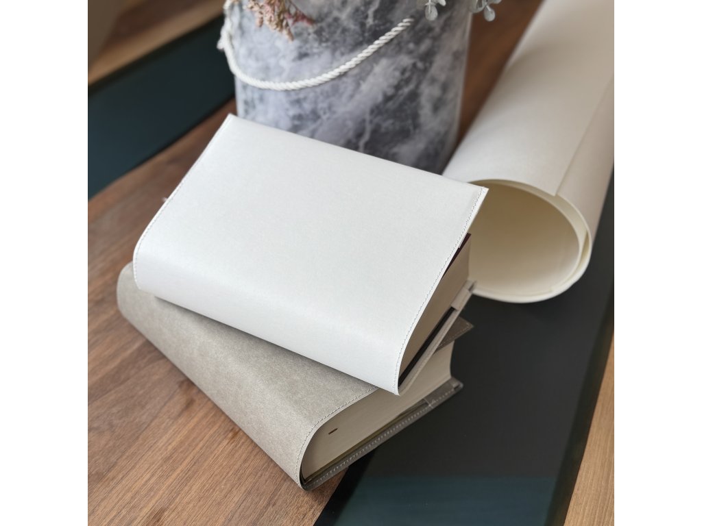 Ručně šitý obal z kvalitního pratelného papíru, který je příjemný na dotek a odolný pro každodenní používání. Díky nastavitelnému zadnímu přehybu se snadno přizpůsobí tloušťce knihy – klopa se jednoduše zahne pod přišitý pásek ze stejného materiálu.