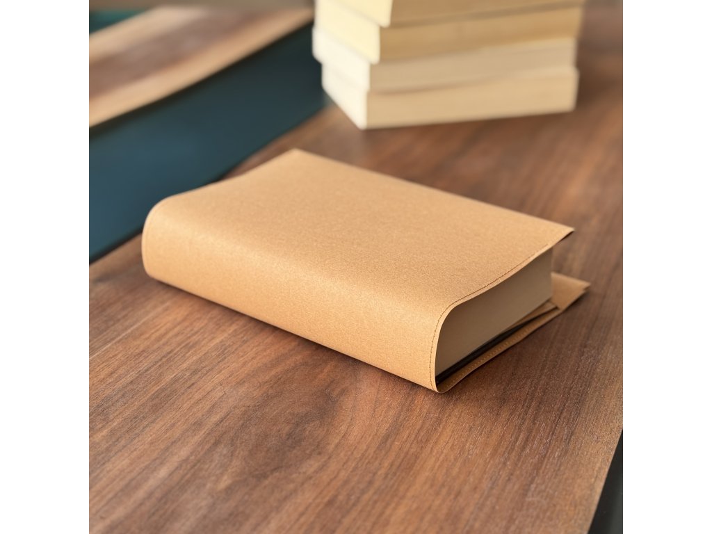Ručně šitý obal z kvalitního pratelného papíru, který je příjemný na dotek a odolný pro každodenní používání. Díky nastavitelnému zadnímu přehybu se snadno přizpůsobí tloušťce knihy – klopa se jednoduše zahne pod přišitý pásek ze stejného materiálu.